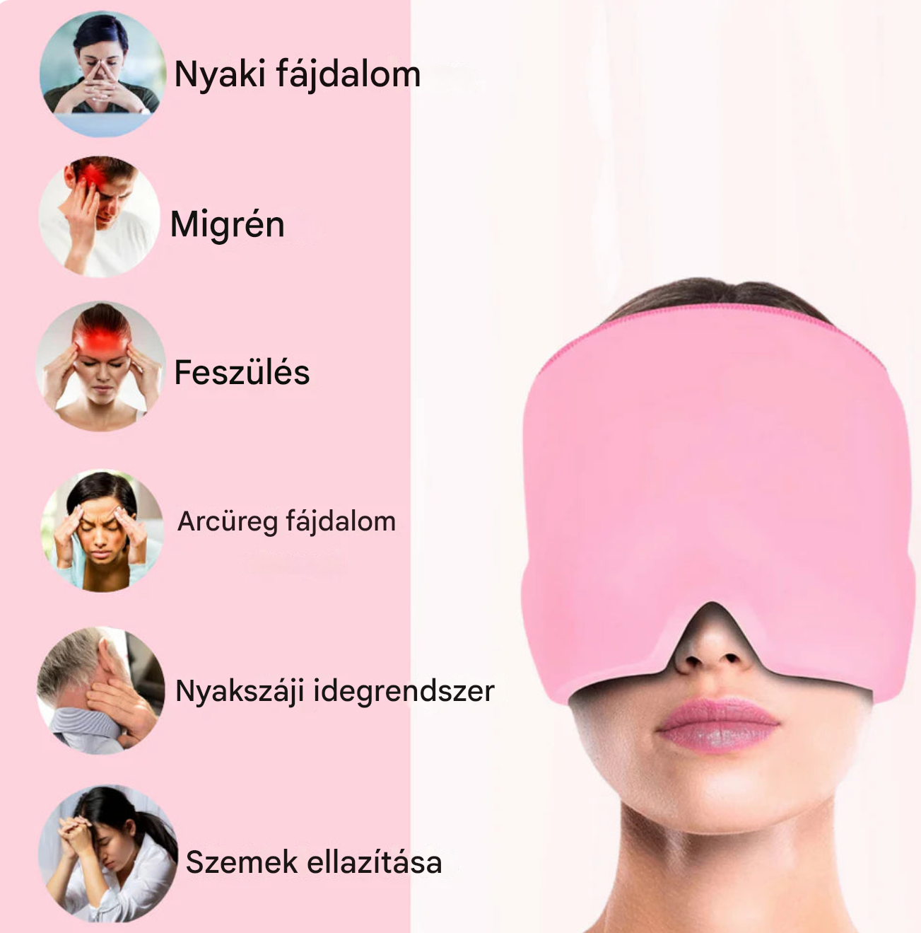 A hűsítő gél azonnal enyhíti a fejfájást, miközben a fényzárás segít ellazulni és regenerálódni.